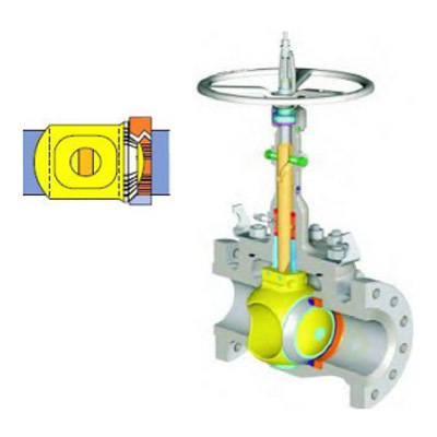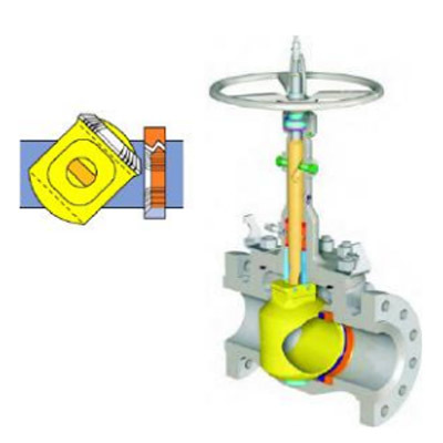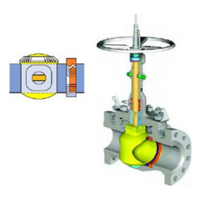 | 在关闭位置,阀芯(黄色)在阀杆(铜色)机械施压下紧紧地挤压阀座(橙色)上。 | 当逆时针转动手轮时,阀杆向上运动,其底部角形平面使阀芯偏离阀摩。 | 阀杆继续提升,并与阀杆螺旋槽内的导销相互作用,使阀芯开始无摩擦旋转。 | 到全开位置,阀杆已经上升到极限位置,阀芯也转到全开通位置。 |