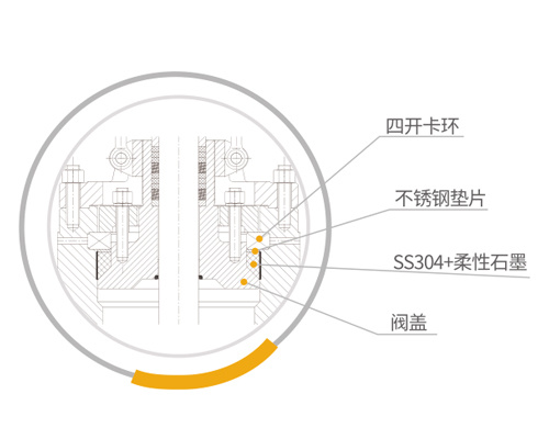 ⊙ 在楔形密封环上部增设一个不锈钢垫圈,使四开卡环与密封圈接触受力更加均匀,防止密封圈高压下由于受力不均与而变形。