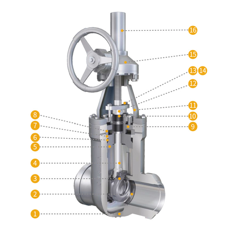 01. 阀体 02. 阀座 03. 阀板 04. 阀杆 05. 阀盖密 06. 密封环 07. 不锈钢垫环 08. 四开卡环 09. 牵制环 10. 填料 11. 支架 12. 填料压盖 13.螺栓 14. 螺母 15. 驱动装置 16. 防尘罩