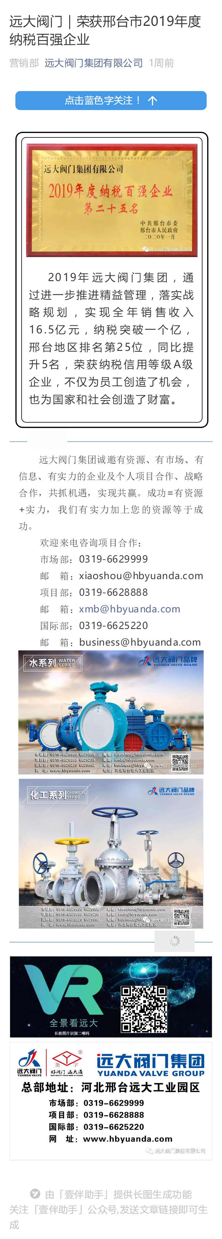 远大阀门|荣获邢台市2019年度纳税百强企业
