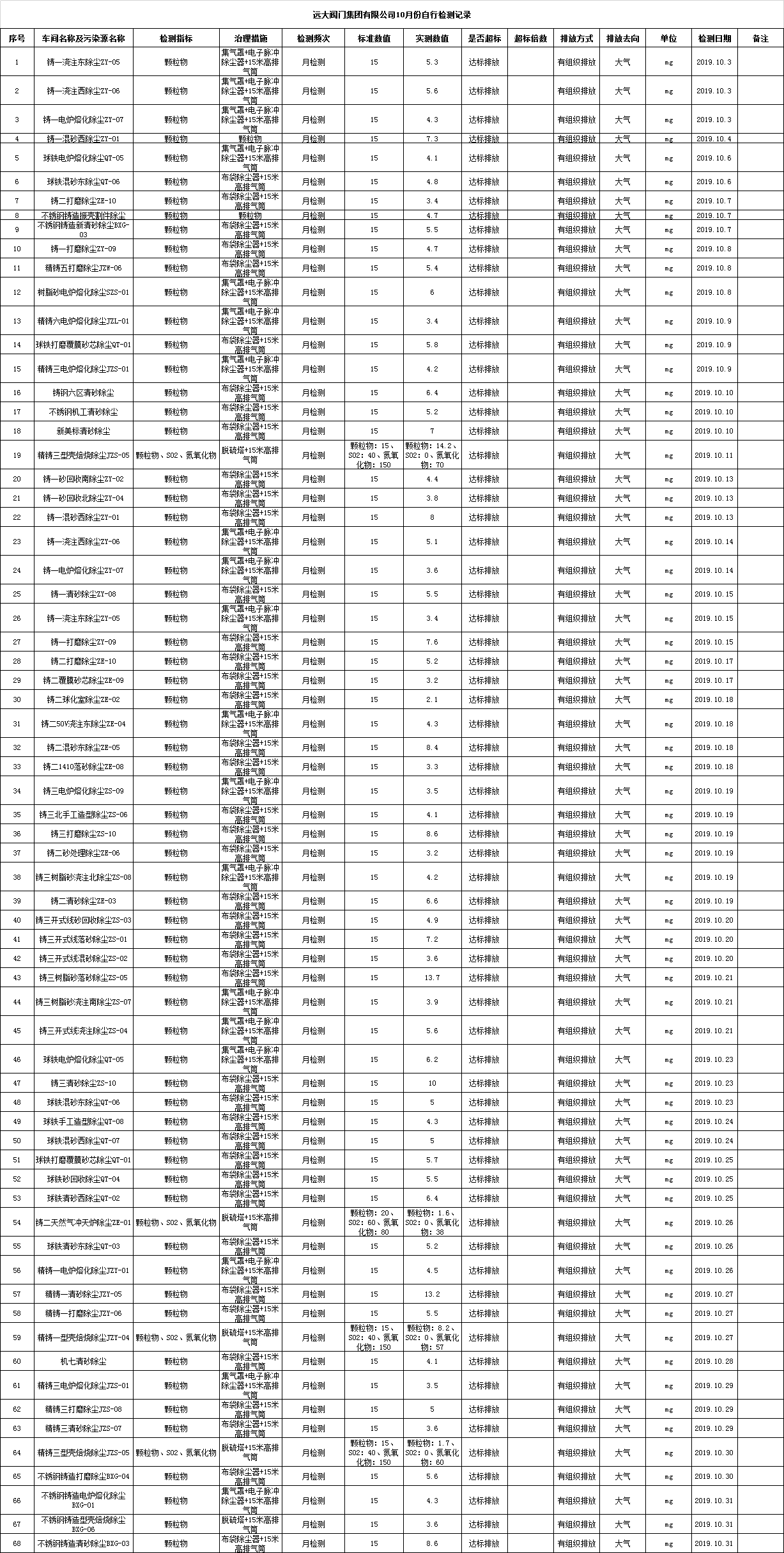 远大阀门集团有限公司2019年10月份污染物检测记录